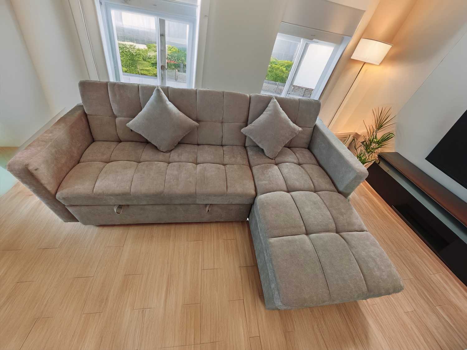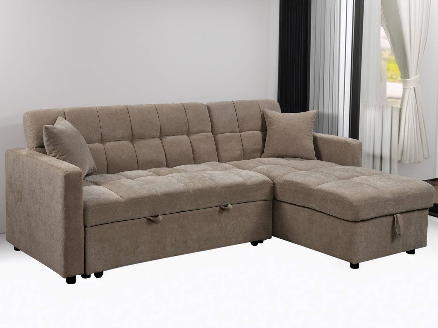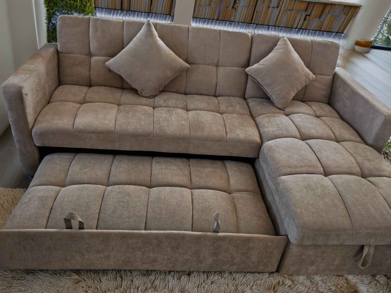 A stunning and modern beige sofa, the Carson is an L shaped sofa bed with additional storage featured under the end piece – easily accessible by an attached fabric strap at the foot of the unit. This storage space is ideal for extra pillows and bedding this unit may require!