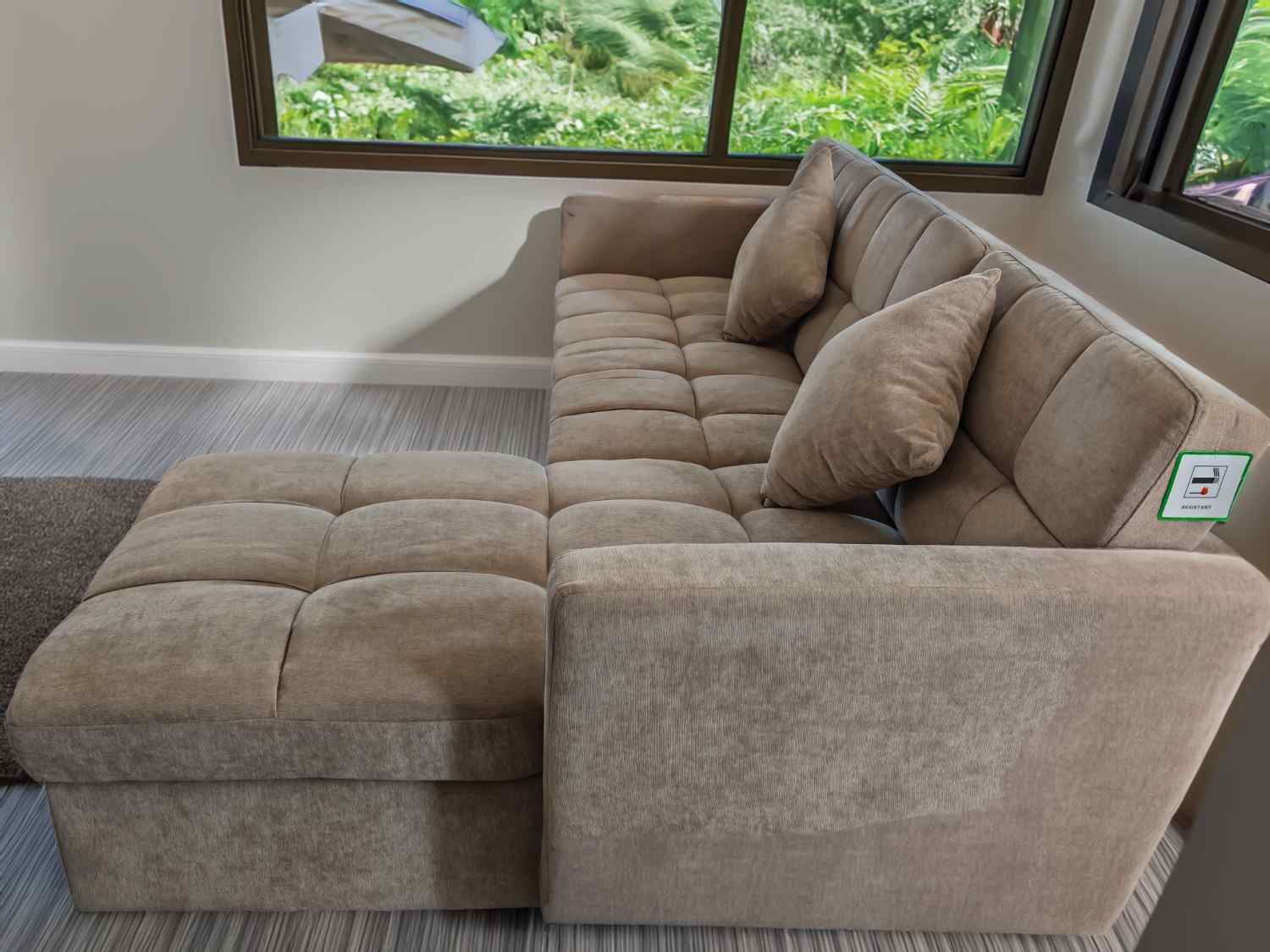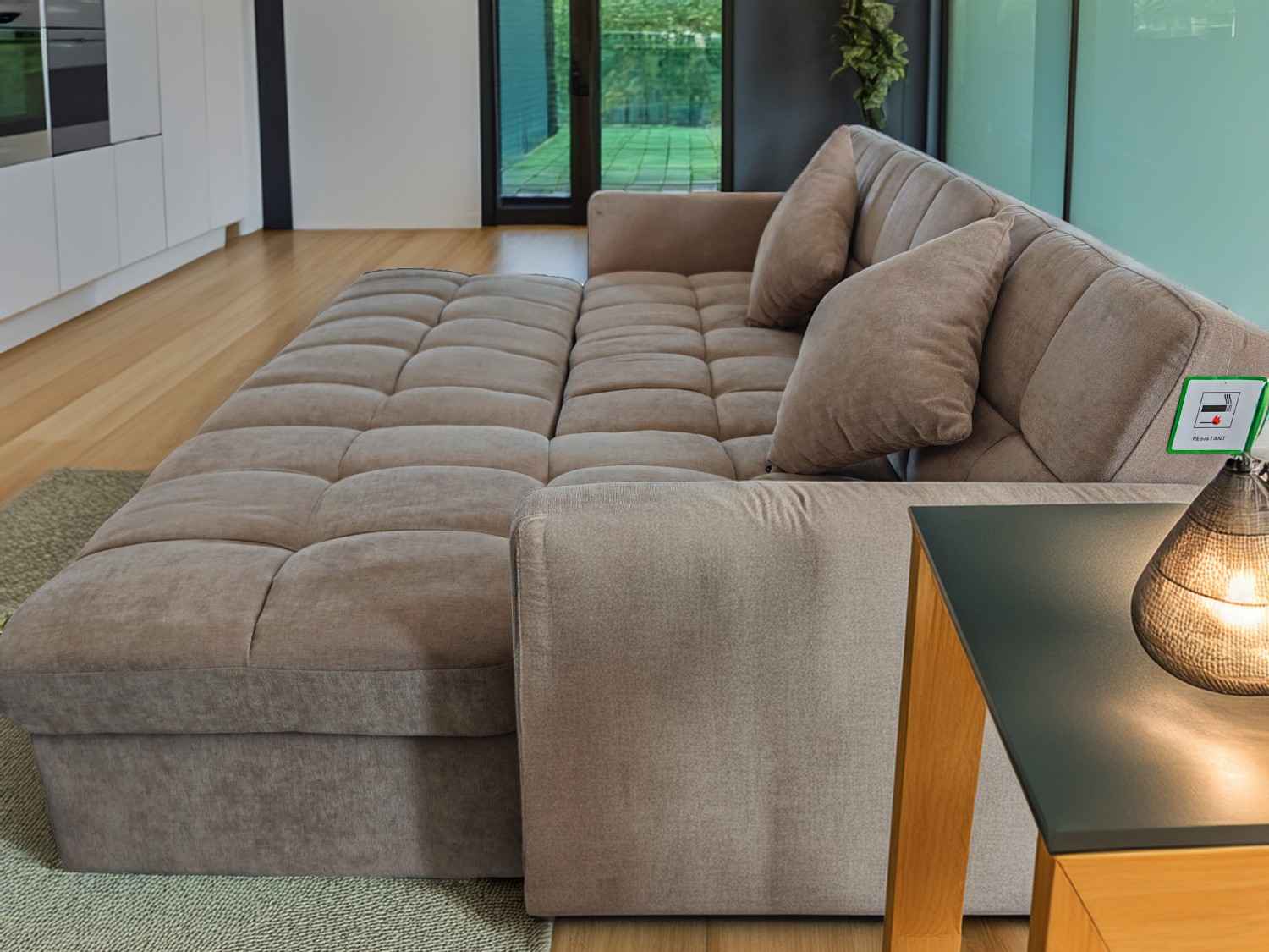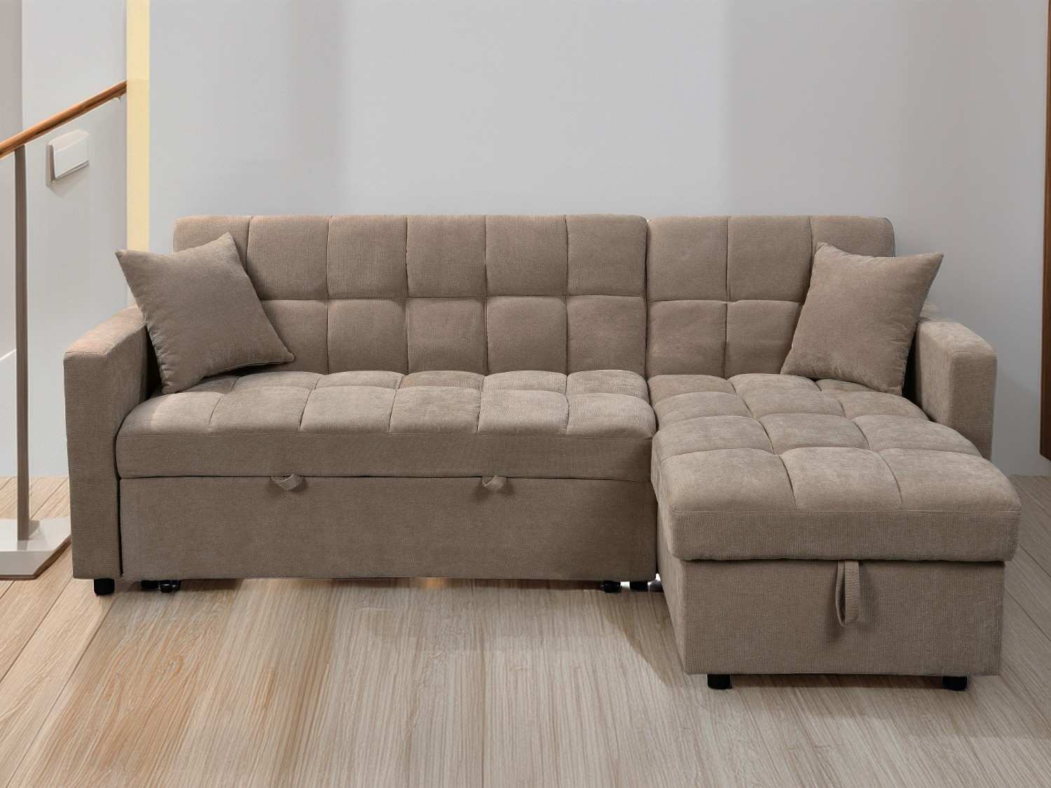 A stunning and modern beige sofa, the Carson is an L shaped sofa bed with additional storage featured under the end piece – easily accessible by an attached fabric strap at the foot of the unit. This storage space is ideal for extra pillows and bedding this unit may require!