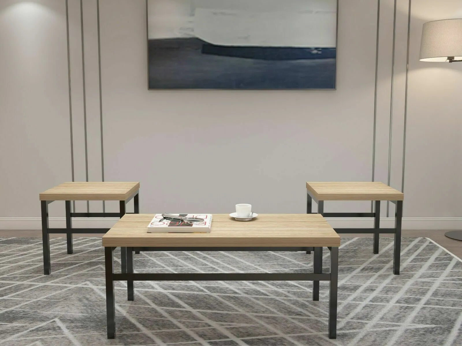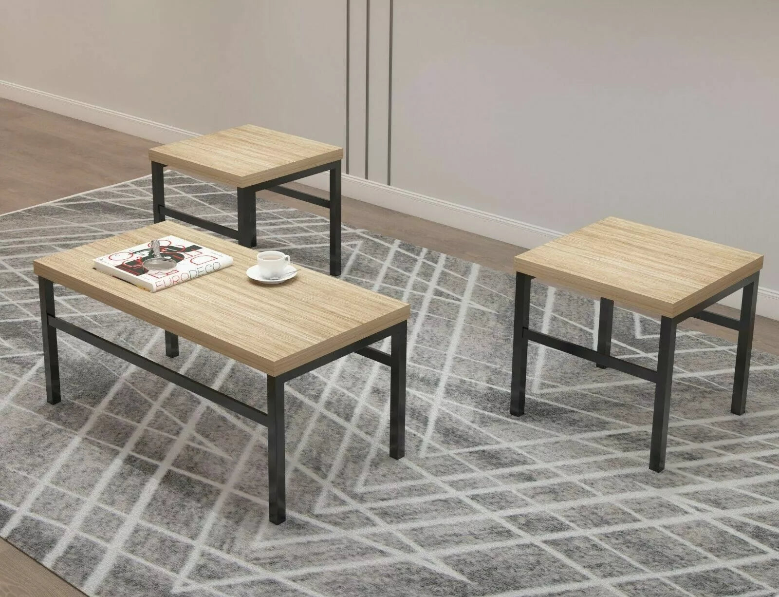 Simple yet effect contemporary pieces with a strong and sturdy black metal frame work complemented by the wood effect table tops.The set consists of 1 x Large Rectangular Coffee Table and 2 x Square Side / End Tables.