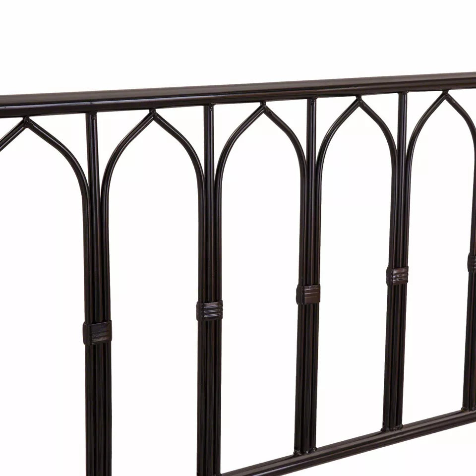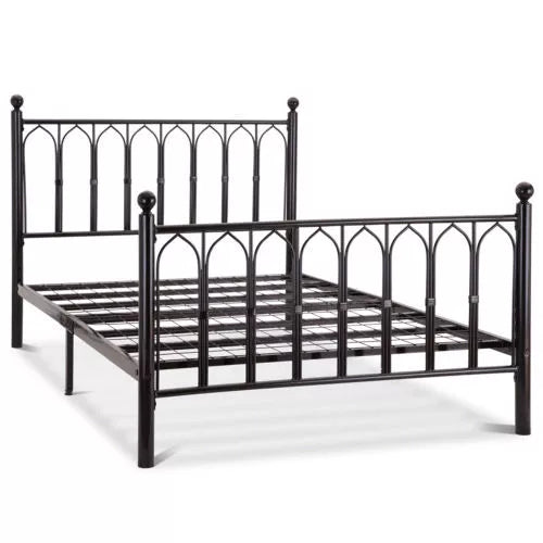 A beautiful gothic style bed featuring metal framework on both the head and foot ends. Finished off with matching finials on each corner post.