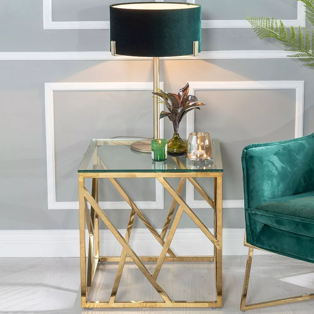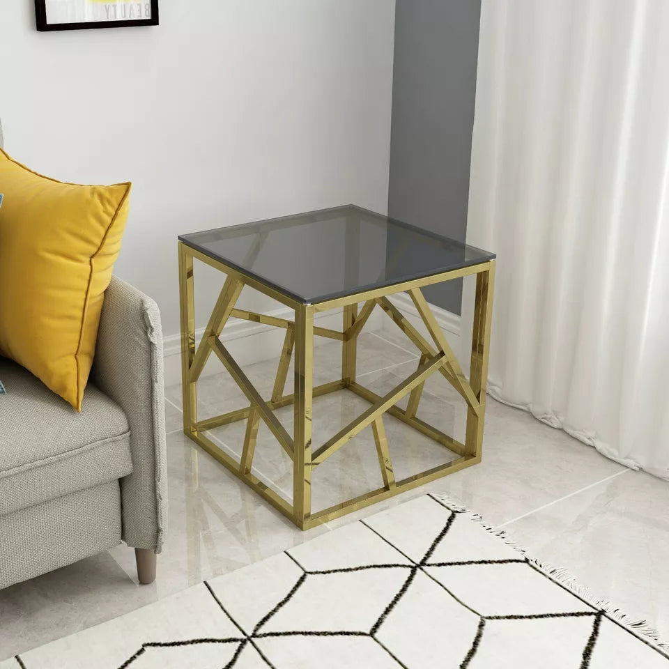 A beautiful side / end table featuring an abstract geometric style gold metal frame work and finished off with grey smoked tempered glass top.