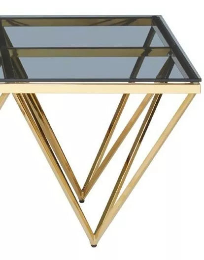 A beautiful side / end table featuring a spiked leg gold metal frame work and finished off with a black smoked tempered glass top.