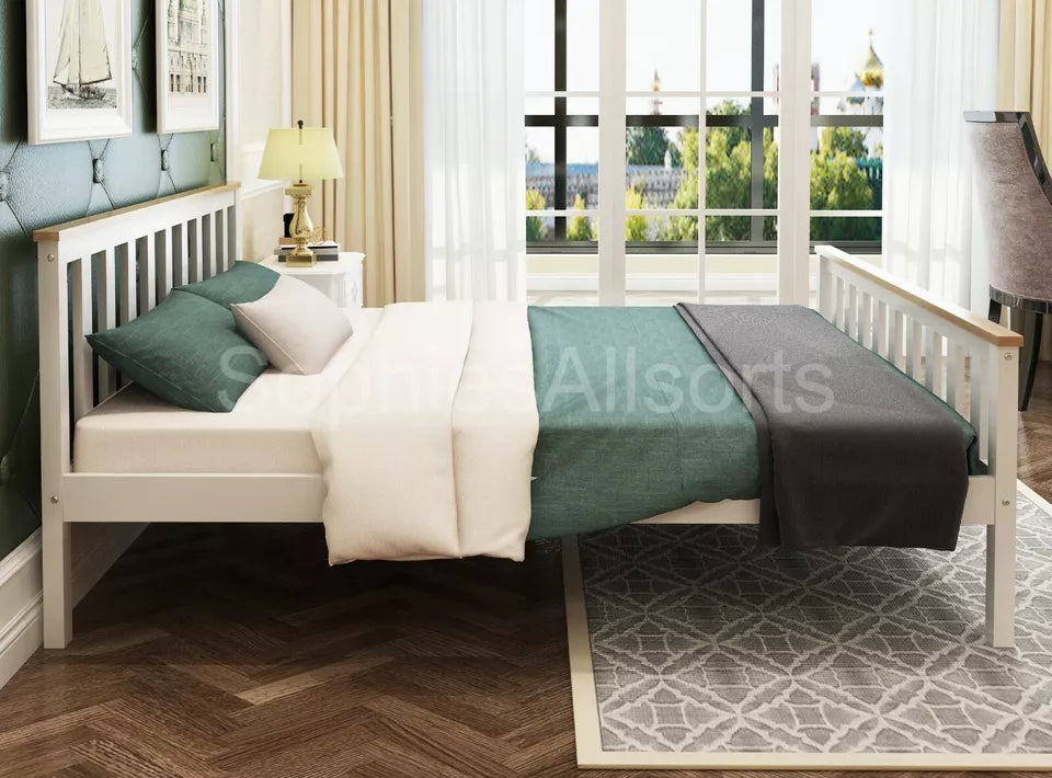 With a clean white painted frame, contrasted with light oak colour top rails on both the head and foot boards.